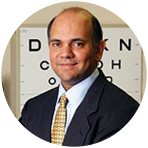 Image of an eye health professional examining a patient’s eyes through a slit lamp.